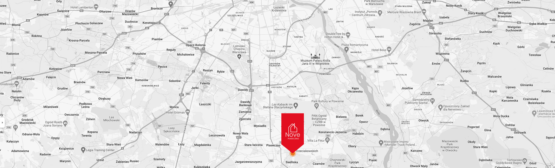 Inwestycja położona jest w Chylicach Pólko w zielonej części Gminy Piaseczno, w sąsiedztwie Konstancina – Jeziornej oraz Józefosławia, w niedalekiej odległości od Warszawy. Dzięki tej lokalizacji Nove Piaseczno pozwala doświadczyć uroku życia z dala od zgiełku miasta zapewniając wymarzony spokój i bezpieczeństwo, nie rezygnując z miejskich udogodnień. Osiedle pozostaje doskonale skomunikowane z Warszawą.